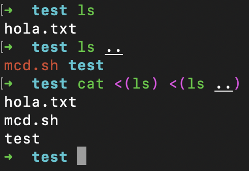 Algunos comandos esperan que su entrada sea un archivo, por lo que es interesante poder asignar la salida de un comando a un archivo temporal que pueda ser consumido por otro programa. El siguiente ejemplo concatenará los archivos de un directorio y su padre.