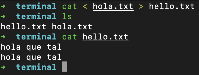 Hemos visto los conceptos básicos de la Terminal y algunos ejemplos de comandos que podemos ejecutar para movernos por nuestro sistema de archivos. Si bien ejecutar estos programas por separado es muy útil, hacerlo en combinación nos aportará una mayor funcionalidad. Para ello usaremos el concepto de streams. Un programa suele tener, como mínimo, un input stream, o stream de entrada, y un output stream, o stream de salida. Como podrás imaginar, estos streams pueden combinarse usando la salida de un programa como entrada a otro. Para ello usamos los símbolos < y > para redirigir la entrada y salida de un programa respectivamente. En el siguiente ejemplo usamos la salida del programa echo como entrada para crear un nuevo archivo.