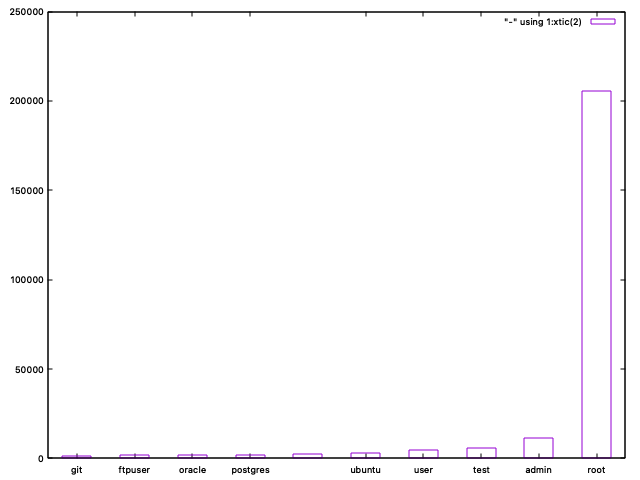 Y también hacer cálculos estadísticos o gráficas con programas que acepten entradas a través de la terminal, como R o gnuplot respectivamente. El siguiente comando genera el histograma de la figura: cat ssh.log | sed -E 's/^.*Disconnected from (invalid |authenticating )?(user)?(.* )?[0-9.]+ port [0-9]+( \[preauth\])?$/\3/' | sort | uniq -c | sort -nk1,1 | tail -n10 | gnuplot -p -e 'set boxwidth 0.5; plot "-" using 1:xtic(2) with boxes'